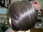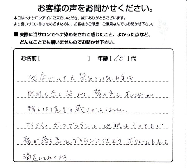 他店でヘナを染めていた時は、地肌も赤く染まり、髪の色も オレンジが強くなりすぎの感じがありました。 アイさんのダークブラウンは、地肌はそのままで髪が落ち着いたブラウンに仕上がり、ボリュームも出て満足しています。