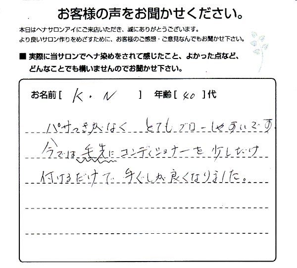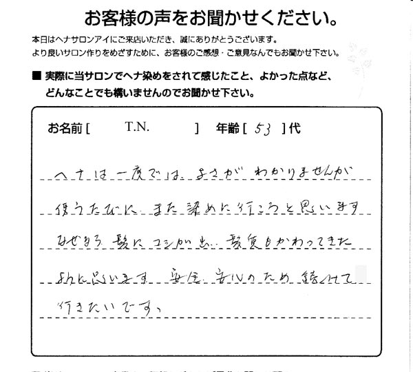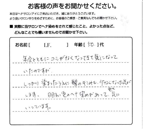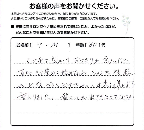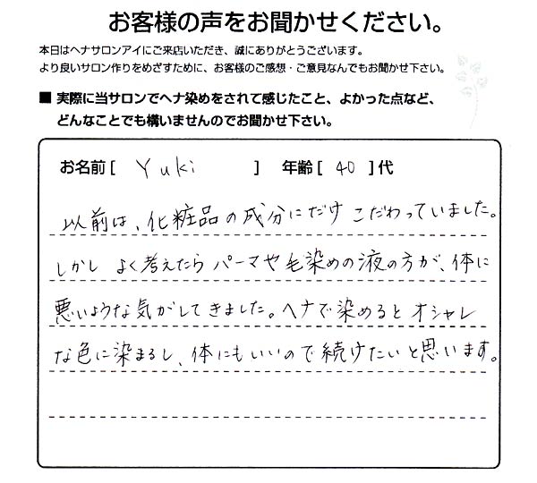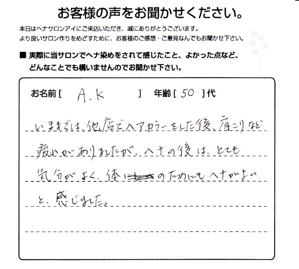 いままでは、他店でヘアカラーをした後、肩こりなど疲れが ありましたが、ヘナの後は、とても気分がよく、体のためにも ヘナがよいと感じました。