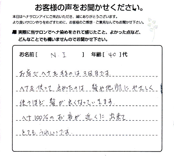 お店でヘナをするのは3回目です。 ヘナを使ってよかったのは、髪や地肌にやさしく使うほど髪がよくなっていきます。 ヘナ100%のお店が近くにできてとてもうれしいです。