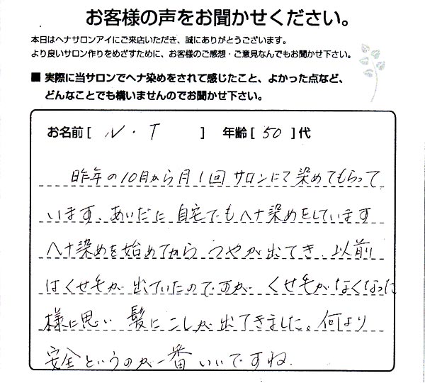 昨年の10月から月1回サロンにて染めてもらっています。 あいだに自宅でもヘナ染めをしています。 ヘナ染めを始めてからつやが出てき、以前はくせ毛が出ていたのですが、くせ毛がなくなった様に思い髪にこしが出てきました。何より安全というのが一番いいですね。