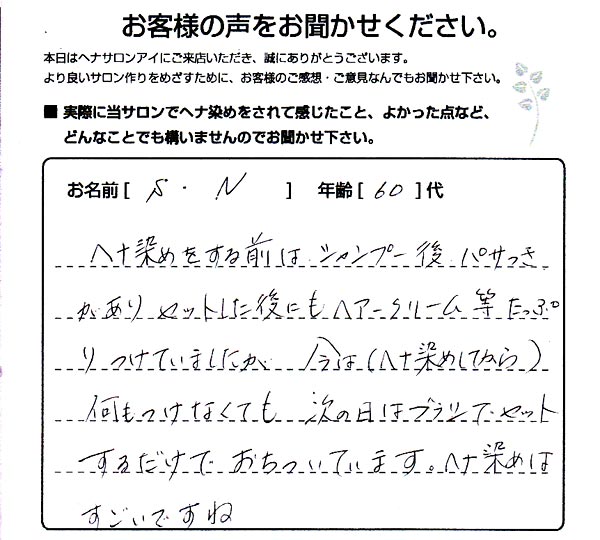 ヘナ染めをする前はシャンプー後パサつきがあり、セットした後にもヘアークリーム等たっぷりつけていましたが、今は(ヘナ染めしてから)何もつけなくても次の日はブラシでセットするだけでおちついています。ヘナ染めはすごいですね。
